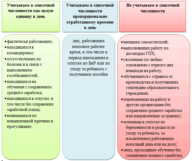 Среднесписочная численность рассчитывается за определенный период времени (месяц, квартал, год). Но некоторые категории работников, включенные в ежедневную списочную численность, в среднесписочную численность не включаются, и это нужно обязательно учитывать при расчетах. Список таких категорий сотрудников:
