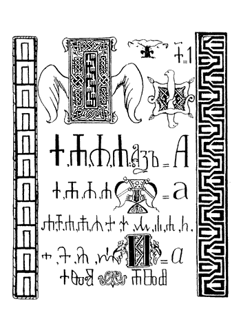 Облик букв ранней (круглой) глаголицы в чём-то совпадает с хуцури, грузинской церковной азбукой, созданной до IX века , возможно, на основе армянской азбуки. Количество букв в грузинской хуцури — 38, совпадает с количеством букв в славянской азбуке, упомянутых Черноризцем Храбром в его трактате «О письменах» .