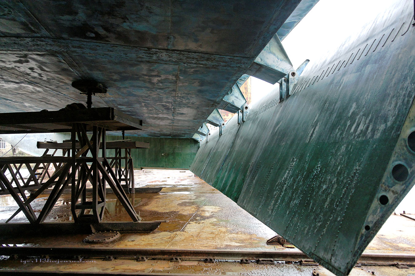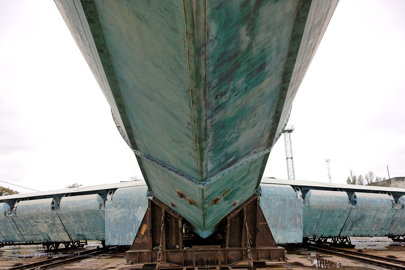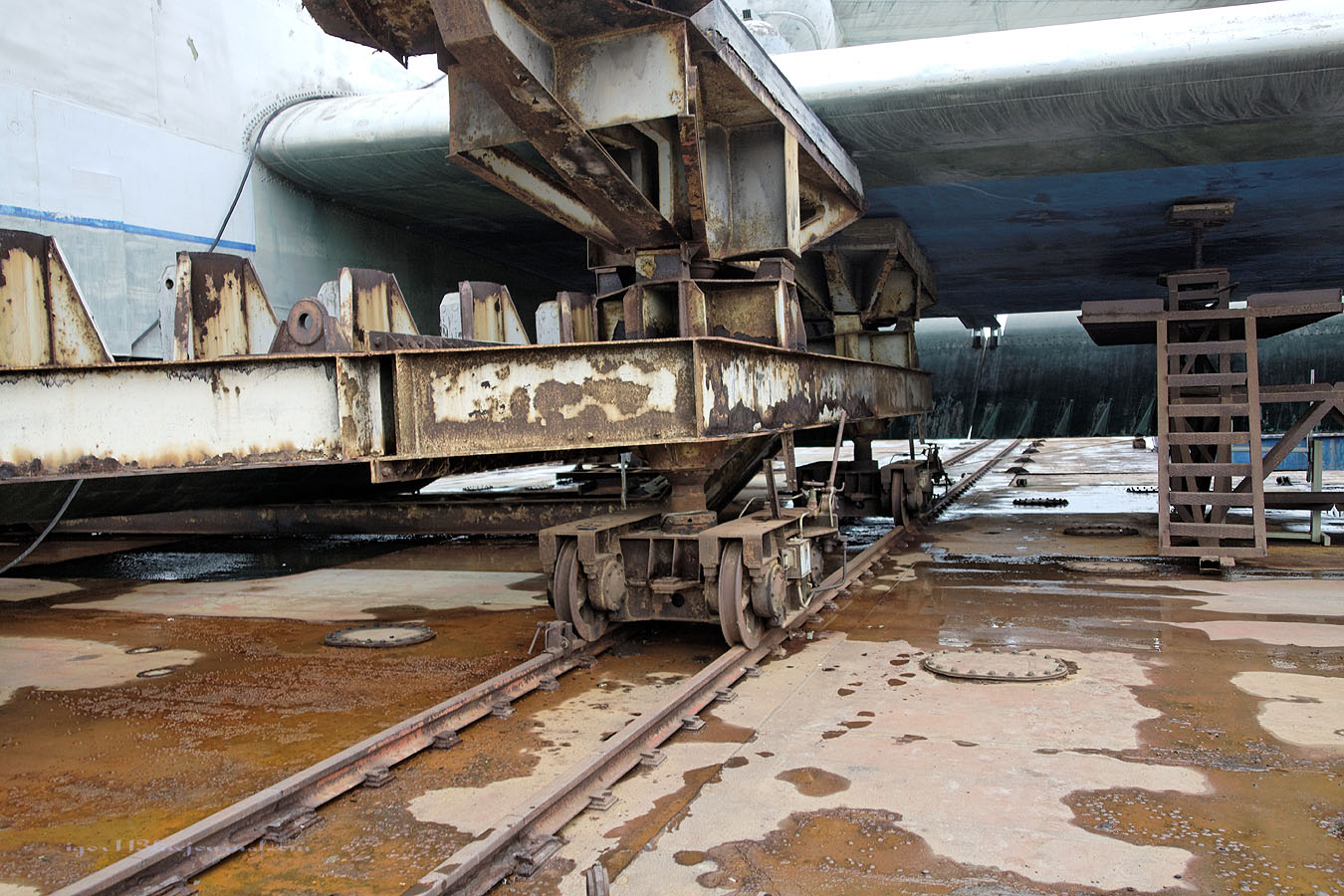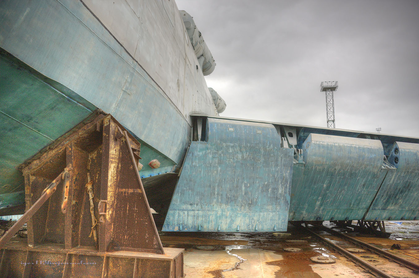 Лунь располагается на доке,специально сконструированном для него,грузоподъемностью 500тонн.