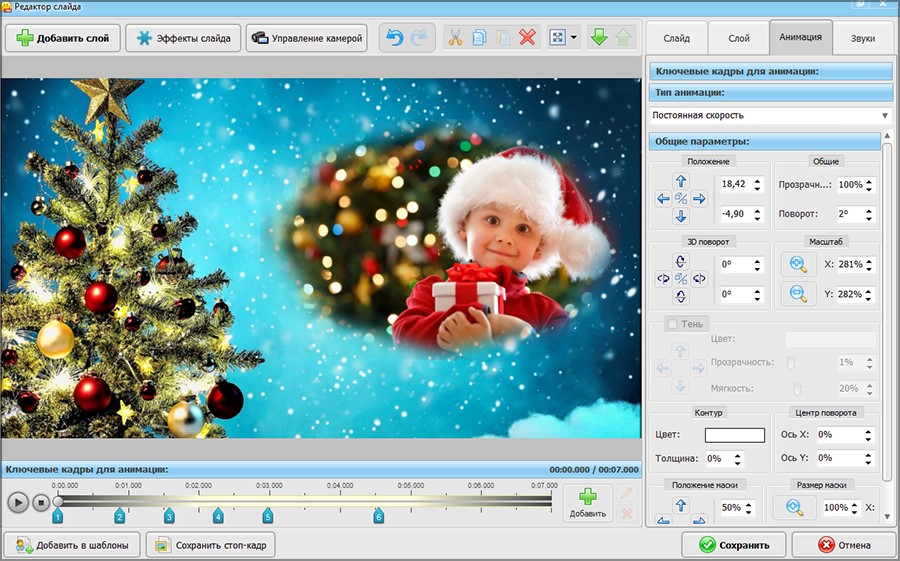 Пользователи, которые хотят лично продумать всё слайд-шоу от начала и до конца, непременно оценят работу с ключевыми кадрами. Эта функция позволяет настраивать анимацию каждого элемента отдельно. Таким образом, вы можете определить траекторию движения любых элементов слайда, настроить повороты, приближения и отдаления объекта во время показа.