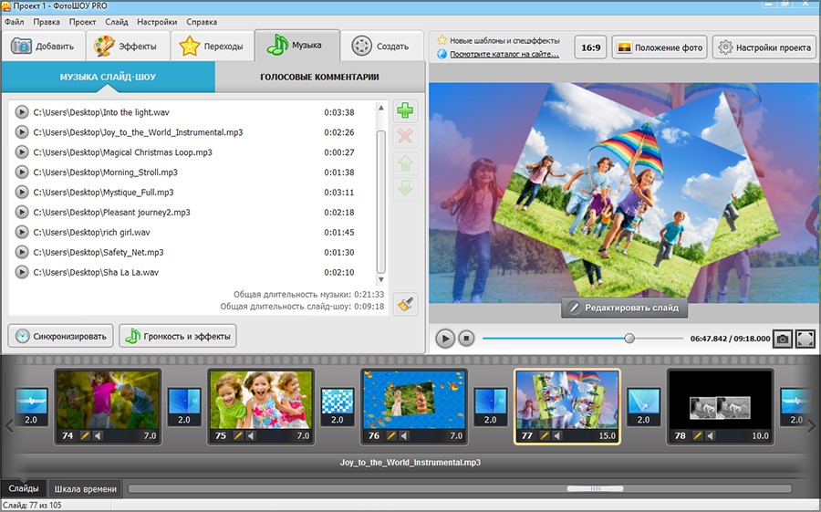 «ФотоШОУ PRO » — это универсальная программа для создания презентаций из фотографий и видео. Добавив различные эффекты и переходы, настроив анимацию и дополнив показ тематической мелодией, вы получите в свое распоряжение качественный видеоролик, способный произвести впечатление даже на самого скептически настроенного зрителя. И это еще не все функции программы! Узнать подробнее о других возможностях вы можете прямо сейчас на сайте программы.