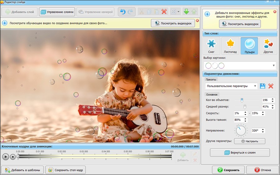 Эффекты первого типа — это всевозможные природные эффекты, фигуры, воздушные шары, сердца, голуби, облака и многие другие. Ко второму типу программа для создания презентаций из фотографий относит различные эффекты свечения — летающие и мерцающие объекты, искры, сияющие фигуры и прочее. Любые из названных эффектов вы можете применить к слайду, а после настроить их показ: определить число элементов на экране, скорость полета, направление и т.д.