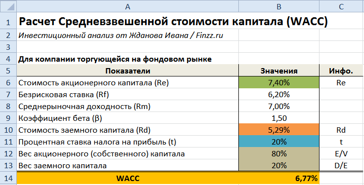 Пример №1. Расчет WACC в Excel на основе модели CAPM