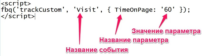 Вы можете использовать Стандартные События для: [ Оптимизации вашей рекламы для конверсий : Facebook позволит вам выбрать событие, если цель вашей кампании – «Повысить конверсии на вашем сайте». Объявления будут оптимизированы для получения лучших результатов для желанного события. Это очень полезная штука для ecommerce сайтов (оптимизация События “Совершение покупки”), сайтов-аффилиатов (обычно используется Событие “Лид”) или сбора email потенциальных клиентов ] [ Создание Индивидуально настроенных аудиторий : Вы можете настраивать очень мощные индивидуальные аудитории: выберите Индивидуализированная аудитория > Трафик веб-сайта > Индивидуально настроенная комбинация ] Пример кода События с различными параметрами : fbq(‘track’, ‘Purchase’, { content_type: ‘product’, content_ids: ‘’, content_name: ‘Shoes Woman 37’, category_name: ‘Shoes Woman’, num_items: ‘1’, value: ‘28.00’, currency: ‘USD’, town: ‘Khrakov’, country: ‘UA’, payment: ‘Cash on Delivery’, coupon_used: ‘yes’, coupon_name: ‘promo’, }); Это пример События “Совершение покупки” с разными полезными параметрами. Это Динамическое объявление, потому что оно подтягивает content_type и content_ids и имеет ценность и валюту для отслеживания конверсий. Кроме того, он отслеживает полезные параметры, которые вы можете использовать для Индивидуальных аудиторий, например: адрес, тип оплаты или использования купона, название товара и название категории товара, или количество купленных товаров