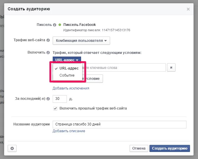 В качестве источника данных можно использовать не только правила для URL адреса, но и События из настроенного пикселя.