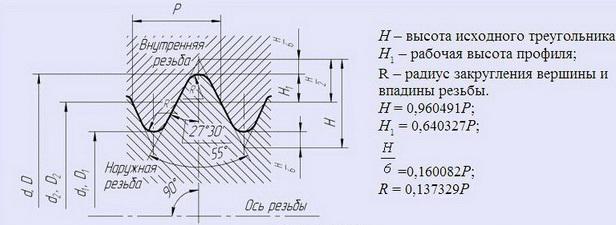 R - радиус закругления вершины и впадины резьбы;