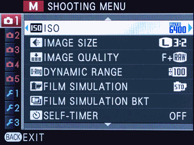 В быстром меню можно задать чувствительность, включить расширение динамического диапазона, отрегулировать баланс белого, включить шумоподавление, установить соотношение сторон кадра (актуально только для JPEG), выбрать формат записи снимков, режим имитации пленки, тоновую коррекцию, отрегулировать насыщенность, резкость, а также настроить яркость дисплея, выбрать точку фокусировки, способ срабатывания вспышки и включить спуск затвора по таймеру.
